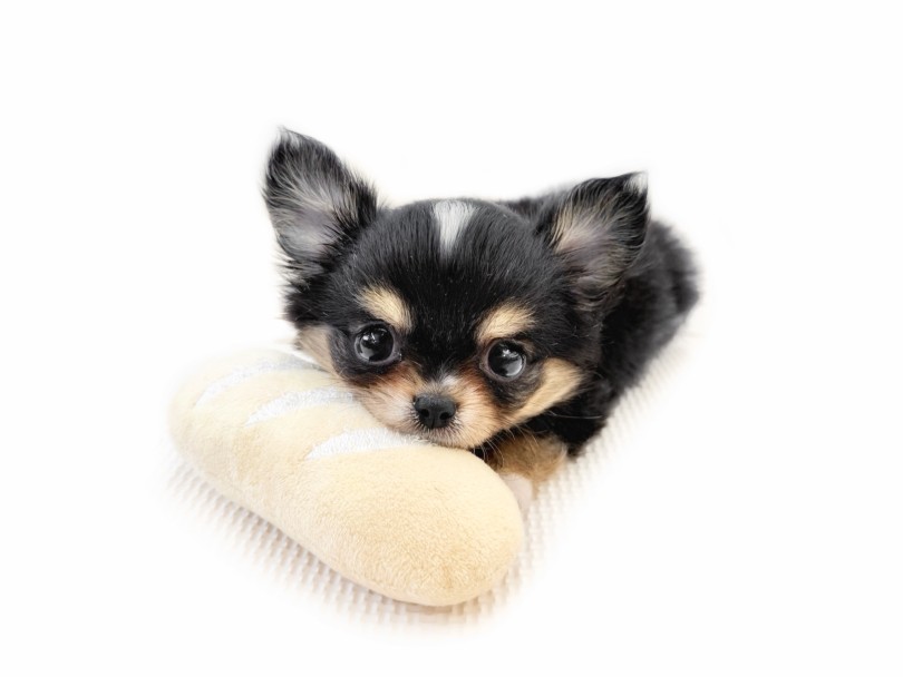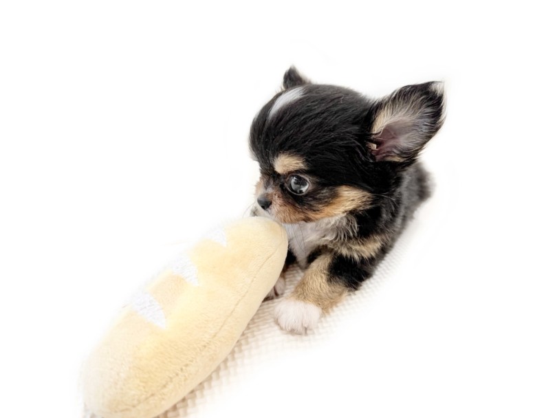 パンのおもちゃにそっと近づき、匂いを確かめる姿からは、この子の性格の良さがすぐに伝わってきます♡チワワにありがちな警戒心はほとんど見られず、初めてのものにも尻尾を振りながら興味津々でアプローチ。