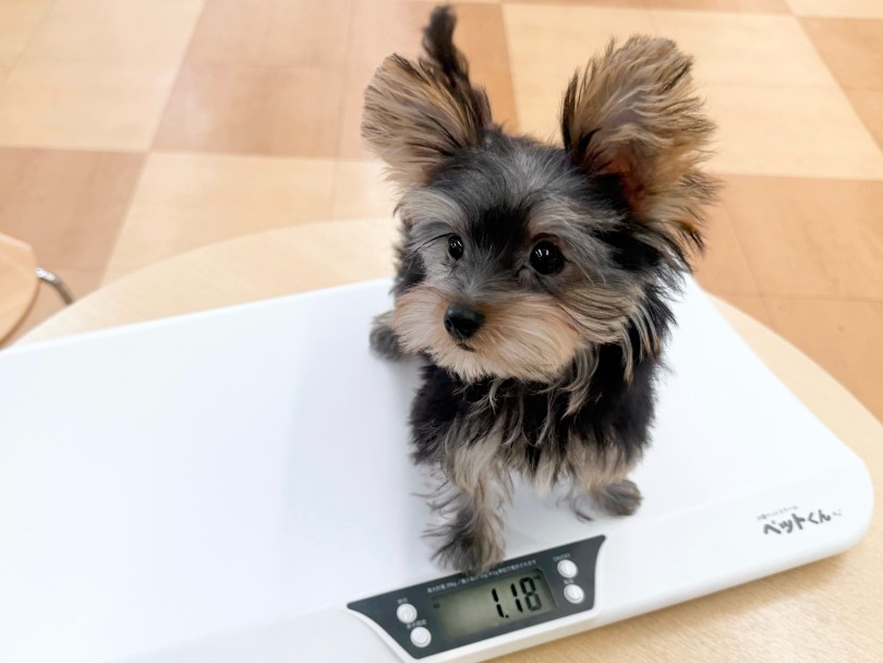 入店時は700g程度だった体重は、1.18kgとしっかり成長!それでも両親共に2kgという小さな遺伝子を持っているので、成犬時の大きさはコンパクトなサイズ感が期待できます♪