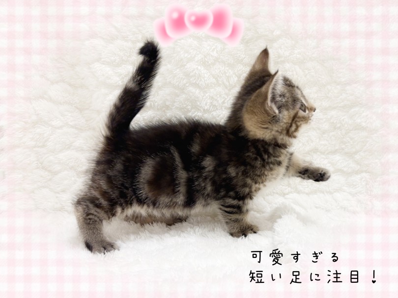 これから成長するにつれて、模様のコントラストや毛並みの美しさがより際立ってくるマンチカンちゃん。元気さと人懐っこさを兼ね備えているので、初めての方にもおすすめしやすいタイプです♡