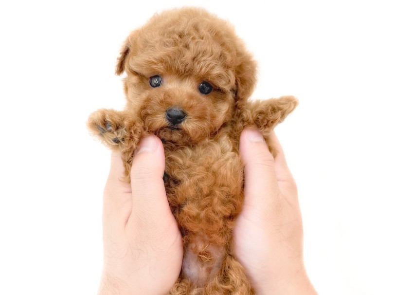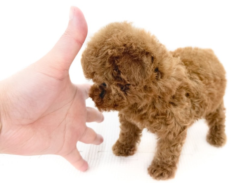 手との比較で分かる通り、かなりコンパクト。手のひらにスッポリと収まってしまうサイズ感で、一般的なトイプードルと比較しても1周り半程度小柄です。