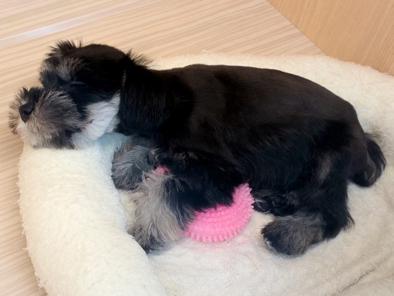 △おもちゃで遊びながら大事に抱えて爆睡モードへ…♡賢く可愛く成長中のミニチュアシュナウザーの女の子!