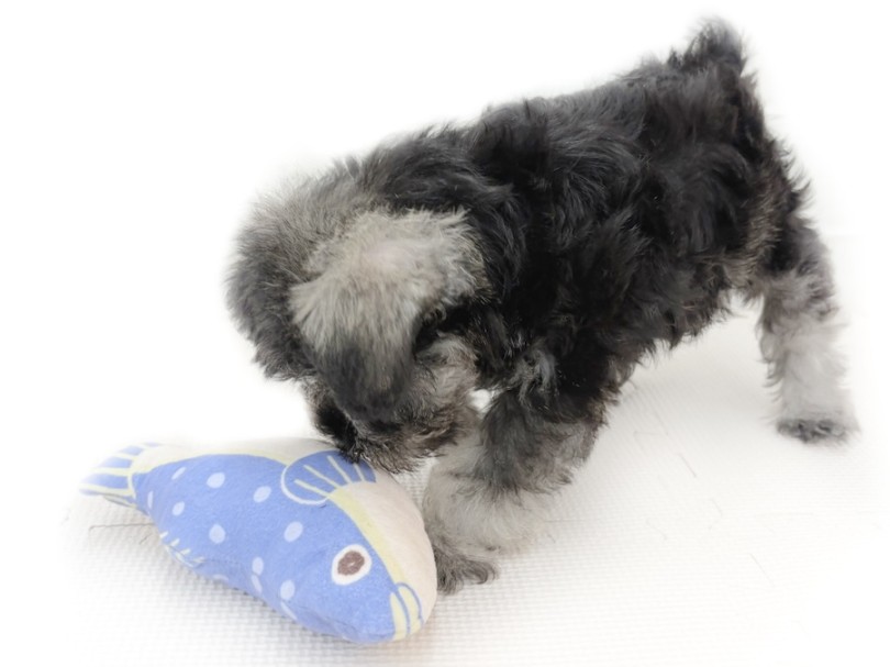 初めてのおもちゃもしっかり嗅いで考えてから、あっという間に遊び方をマスターしてしまうシュナウザーちゃん!