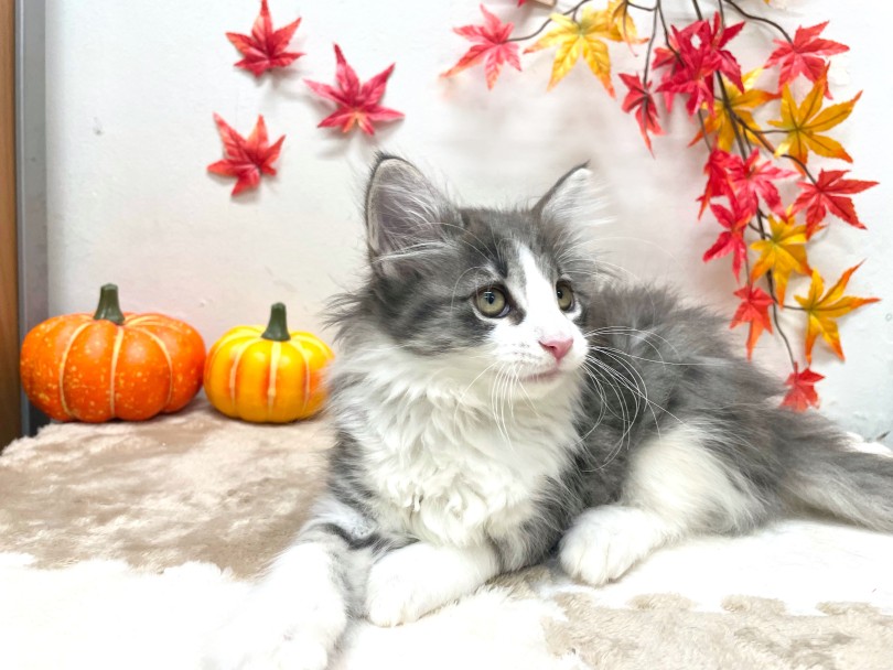 埼玉県川口市にあるペットショップ【マルワン東川口店】に上品なお顔立ちの「ノルウェージャンフォレストキャットブルータビー&ホワイトの女の子が仲間入りしました!
