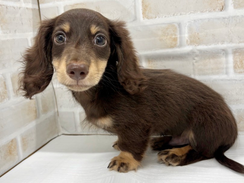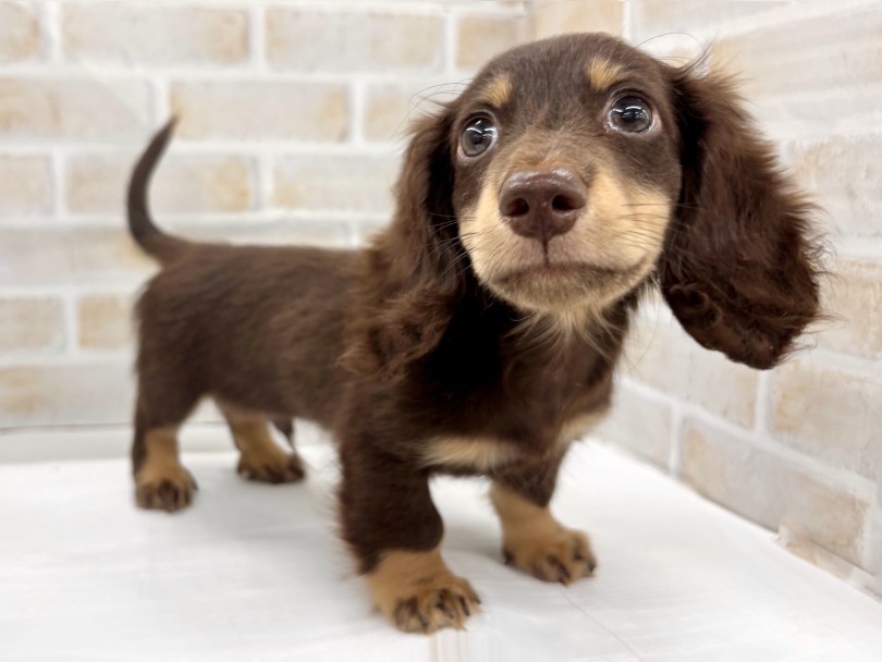 大きなお耳にパーマをかけたようなカールのかかった被毛、ビー玉のような透き通った瞳が魅力的なダックスちゃん!