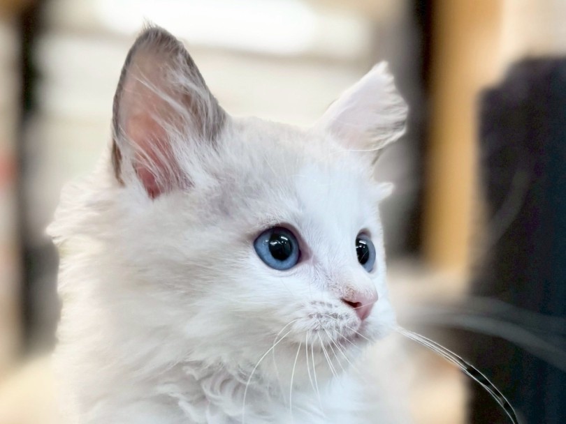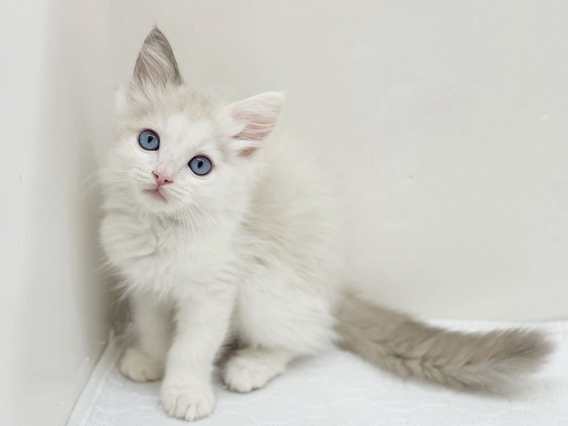 生まれた時は、真っ白で成長と共に発色していく猫種ラグドール。