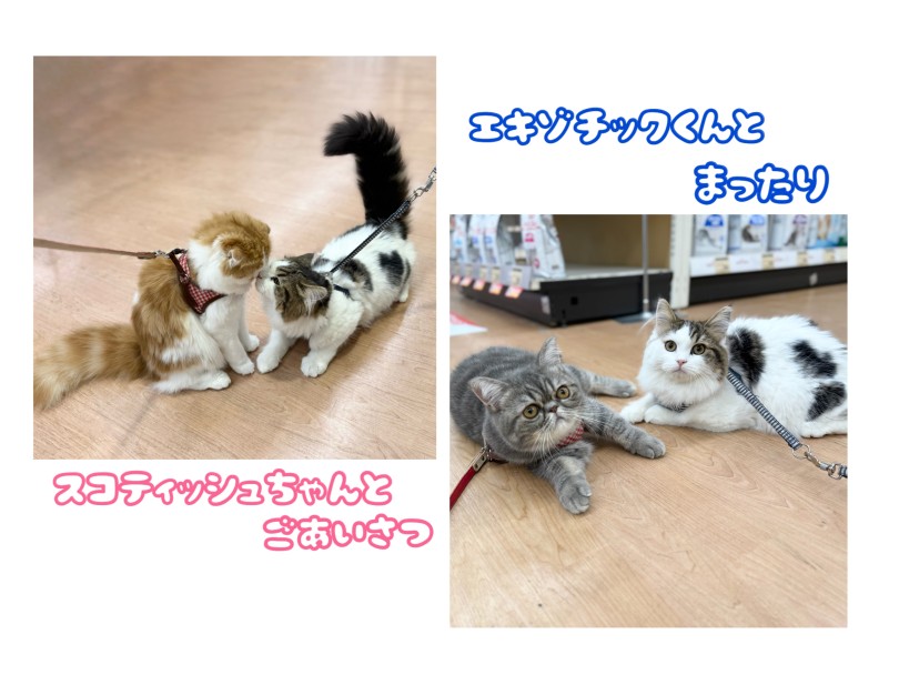 ノルウェージャンくんは、当店在籍中の生後7ヶ月のエキゾチックくん、スコティッシュちゃんとも仲が良く、一緒に店内散歩したり、鼻と鼻でご挨拶などできます!