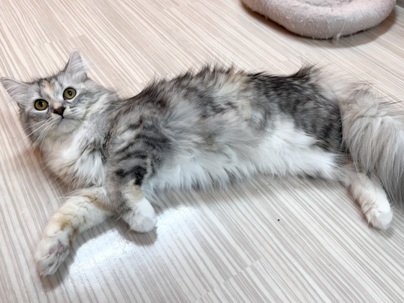 今回紹介するのはとっても甘えん坊で、シルバーパッチドタビーの毛並みがまぶしい美猫「サイベリアン」の女の子です!