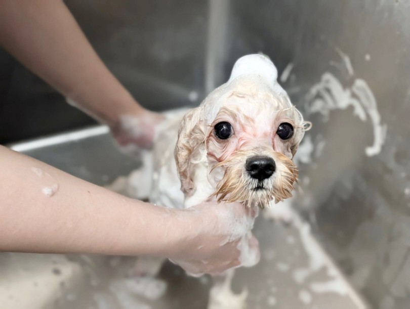 体重3kg前後、見た目の大きさもほぼストップのマルプーちゃんであればご自宅のお風呂場や洗面台などでもシャンプーできるサイズです。