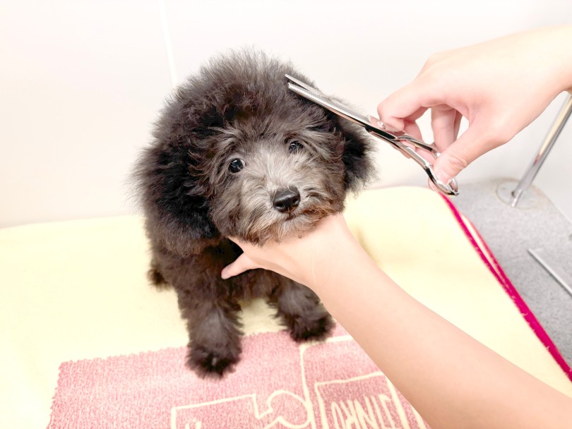 トイプーちゃんは顎下の毛を持たれるのが苦手なようですが、保定をすれば上手に行うことができました!じっとしてカットを受けているトイプーちゃん、とっても可愛かったです!