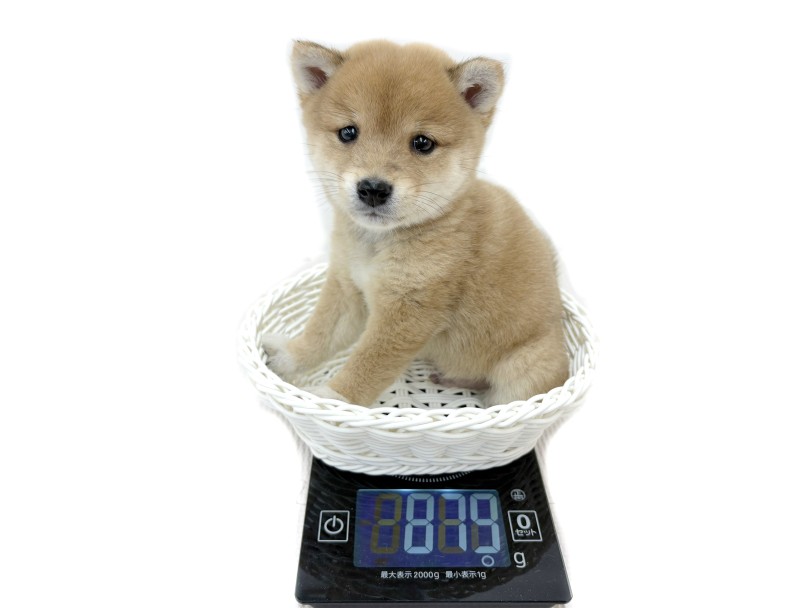 生後2ヶ月時点の体重は879gと1kgにも満たない小ささ。普段、小さなチワワ、トイプードル、ポメラニアンといった超小型犬の体重を計る際に使っているカゴにすっぽり収まるほど小さな豆柴くんです。