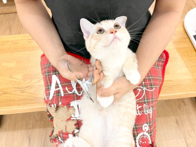 猫は爪切りが苦手な子が多いイメージがあると思いますが、マンチちゃんは爪切りもブラッシングも上手で手足を触っても嫌がらないのでとってもいい子に爪切りできます。お客様が手を触っても嫌がらないので、お家でも難なく爪切りできそうです。