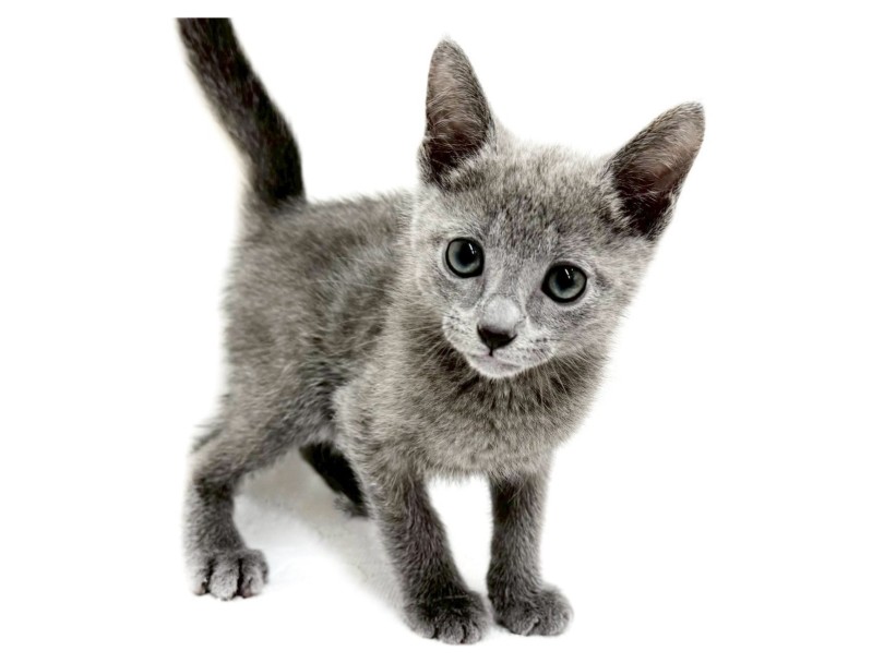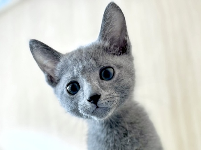 大きなお耳、タマゴ形の小さなお顔と、筋肉質でスラリとしたスリムなボディがクールな印象を与える猫種、ロシアンブルー。