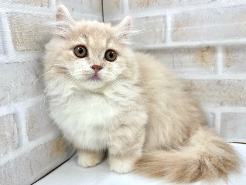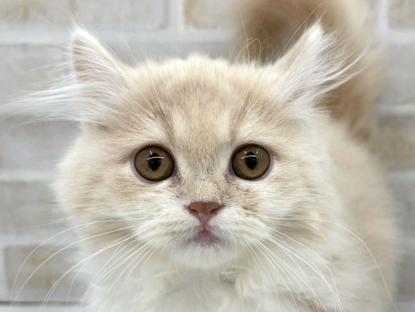 全身を包む被毛は淡いクリームベースにタビー(縞模様)がやわらかく浮かび上がるカラーリング。毛先にかけてほんのりとした濃淡が生まれ、動くたびに“光のグラデーション”で癒されます。