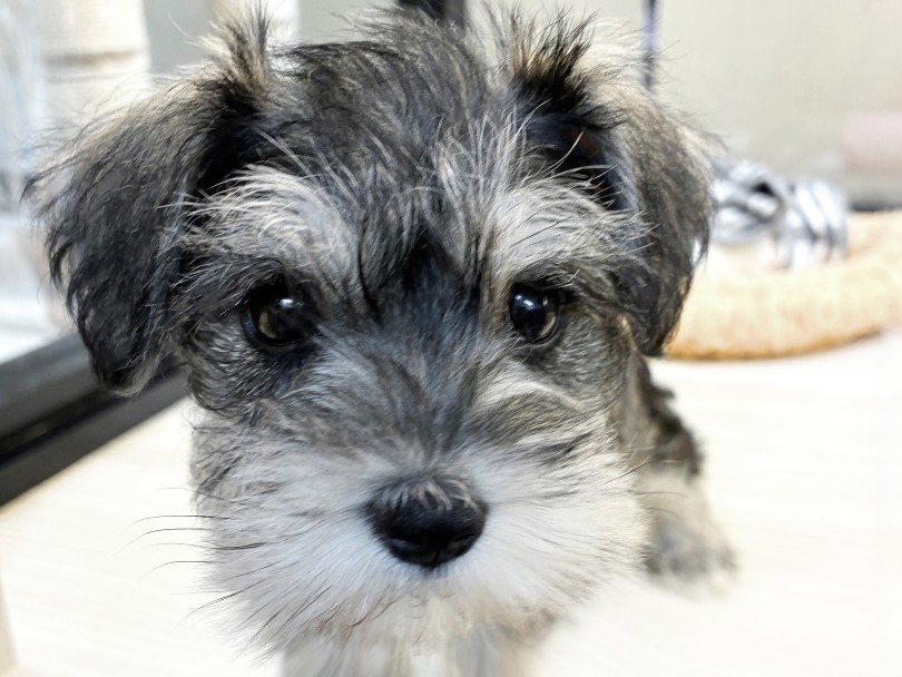 毛色はミニチュア・シュナウザーの中でも人気の「ソルト&ペッパー」。グレーとホワイトが混ざり合った独特の毛色で、子犬のうちは少し濃いめのグレーでも、成長するにつれて明るく上品なカラーへと変化していきます。
