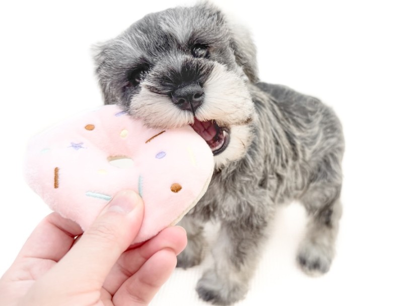 ドーナツのおもちゃに夢中になるシュナちゃん。遊び好きで明るい性格はシュナウザーそのもの!ですが、進みすぎることはなく、ところどころにマイペースでおっとりした仕草が混ざるのがこの子の魅力♪