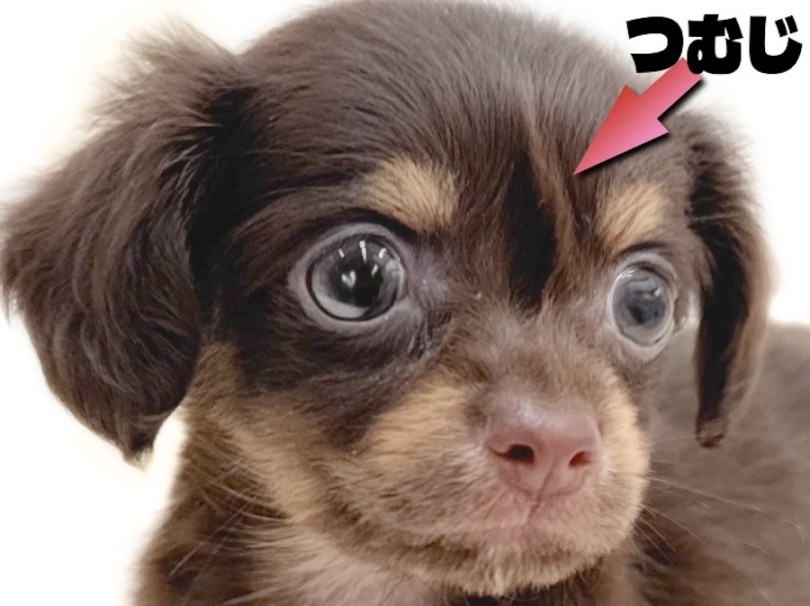 大きな瞳がパッと目を惹くお顔は、タンカラーのマロ眉と口元、そしてチョコタンの子ならではの薄めの茶色のお鼻との配置バランスも最高で、明るめのカラーが入っていることで柔らかく、優しい印象を与えてくれます。そして、眉間の所に現れた【つむじ】。