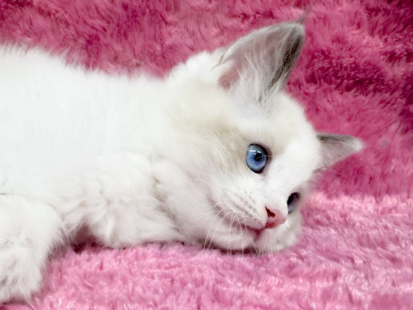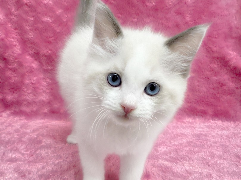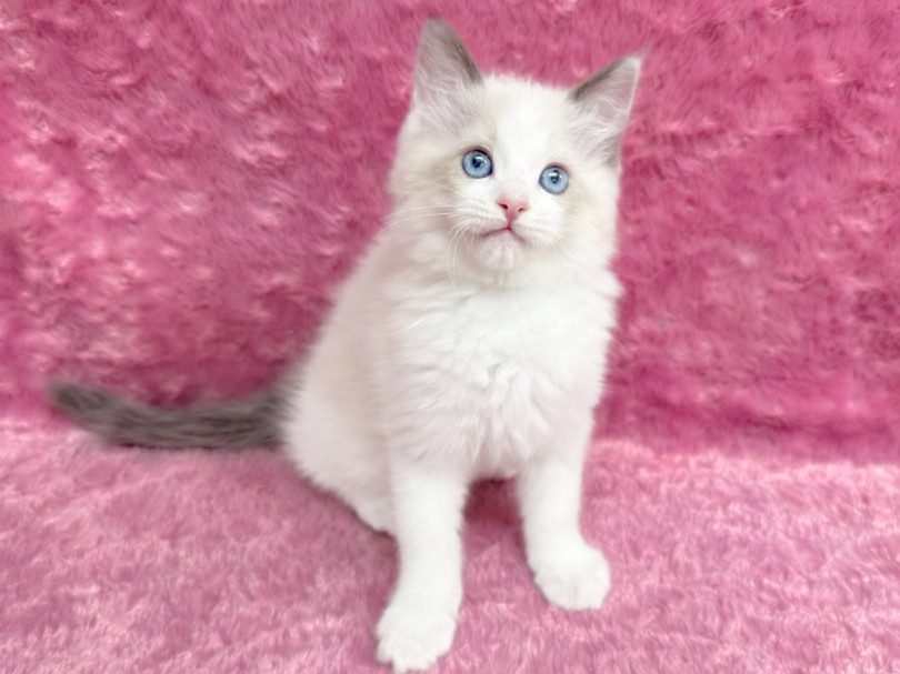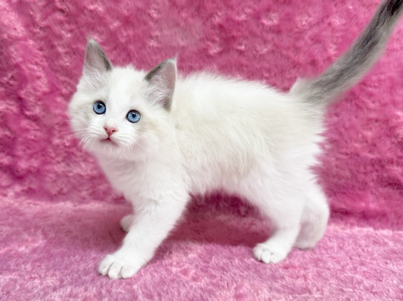 北国の白い鳥として代表的なシマエナガ(雪の妖精)を醸し出すかのような丸みがあり、ふわふわとした膨らみと雪玉のような美しいラグドールちゃんが仲間入りいたしました!