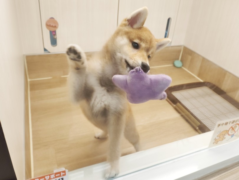 おもちゃを持って来てガラス越しにアピールしてくる豆柴くん。