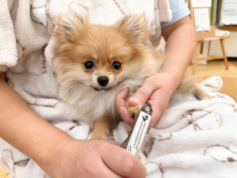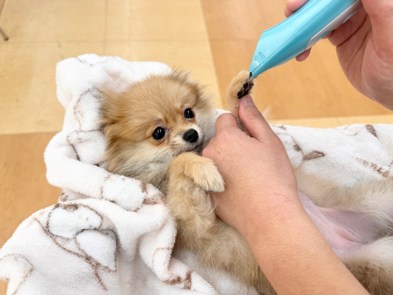 ブラッシングしてくれるんですかー?とスタッフを見つめた後はお膝で落ち着いて何でもされるがままのポメちゃん。お家に行ってもお手入れがこんなに楽にできたら嬉しいですよね♪