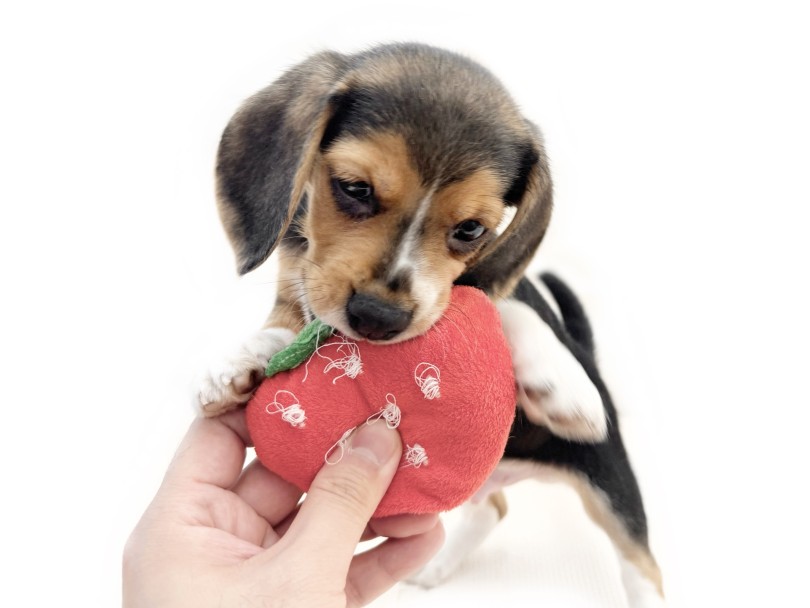 いちごのおもちゃを前にすると、「これ、ぼくのだよ?」とでも言うようにそっと前足を添えて、そーっと後ろに引っ張るビーグルくん。控えめながらもワクワクが隠しきれていない姿がとびきり可愛らしいんです♡♡♡