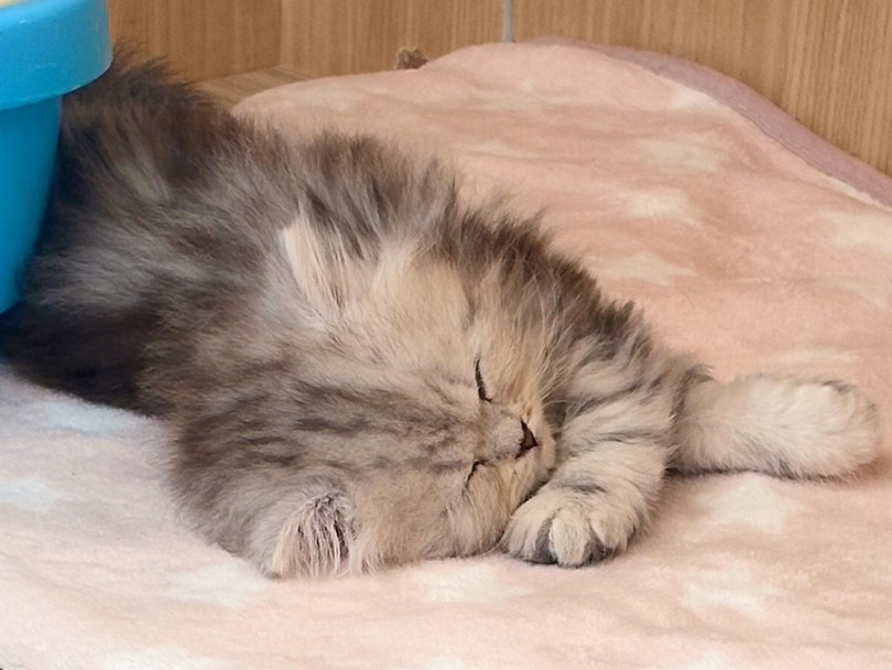 ▲あたたかいヒーターの下でぬくぬくお昼寝タイム♪早速無防備な姿で寝顔を披露してくれる超温厚なペルシャちゃまなのでした♡
