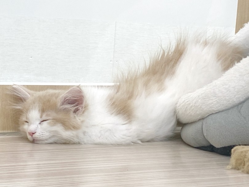 この子の被毛の色はクリームタビー&ホワイトになります。やわらかなクリーム色にうっすらとタビー模様(縞模様)+ホワイトカラーです。