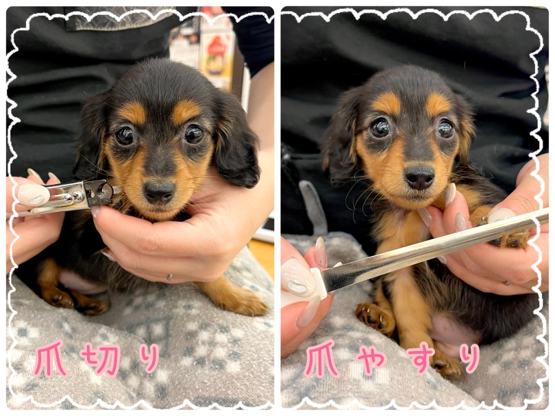 ロングコートのダックスちゃんなので、毛玉・毛もつれ予防の為にも1日1回はブラッシングしてあげて下さい!写真ではスリッカーブラシを使用してますが、子犬の間は毛も短いのでコームブラシでも良いと思います!