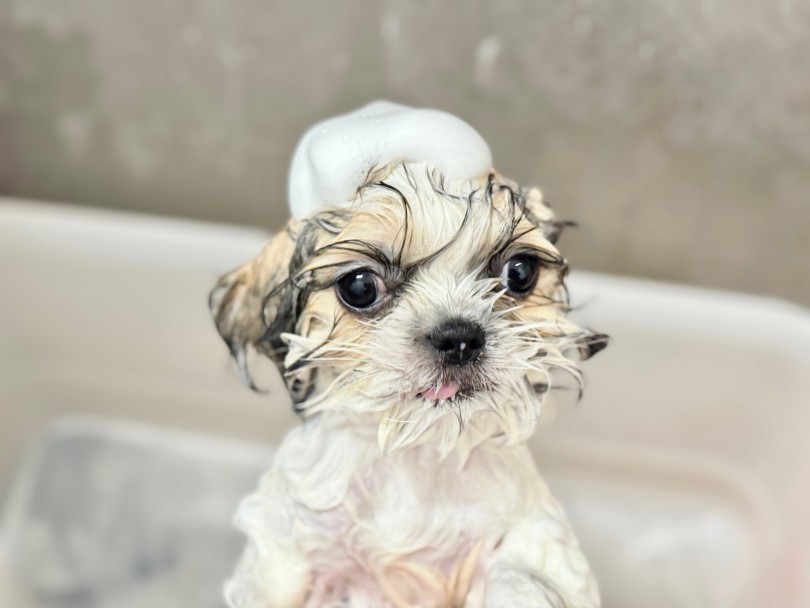 初年度のワクチンプログラムが終わったらトリミングサロンでシャンプー・カットが必要になるけれど、お家でもシャンプーができるように今のうちからシャンプー慣れができるようにお手入れトレーニングを頑張っているわけなのさ♪