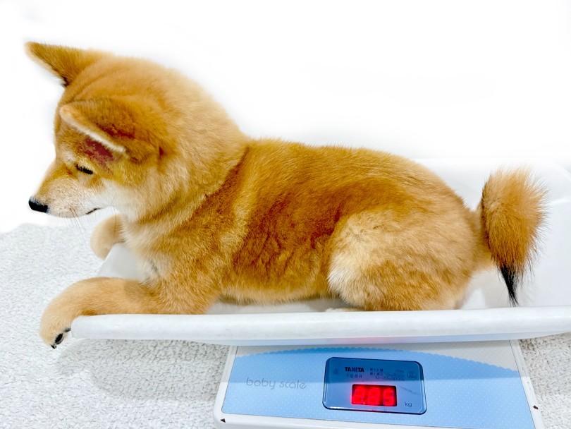 ▲体重計に前足をかけてサーフボードに乗っているかのよう(笑)12月10日時点で体重は約2.85kg。