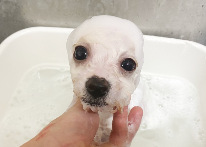 初めてのシャンプーで最初はびっくりしちゃったけど、だんだんリラックスしてきたの。