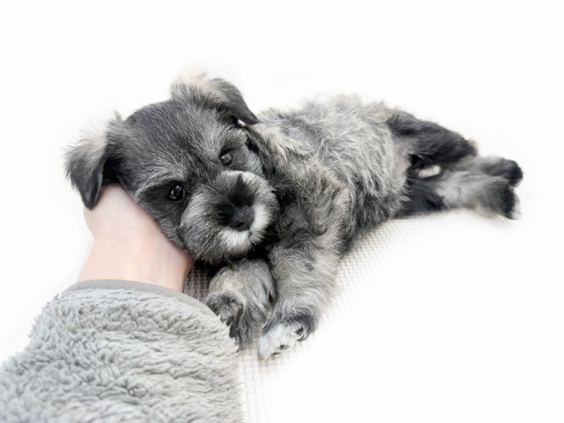 ふんわりとしたソルト&ペッパーの被毛に包まれた、ミニチュアシュナウザーの女の子。一目で女の子とわかる穏やかさがあり、ウルっと潤んだ黒い真珠のような瞳に見つめられると一瞬で心を奪われてしまいます…。