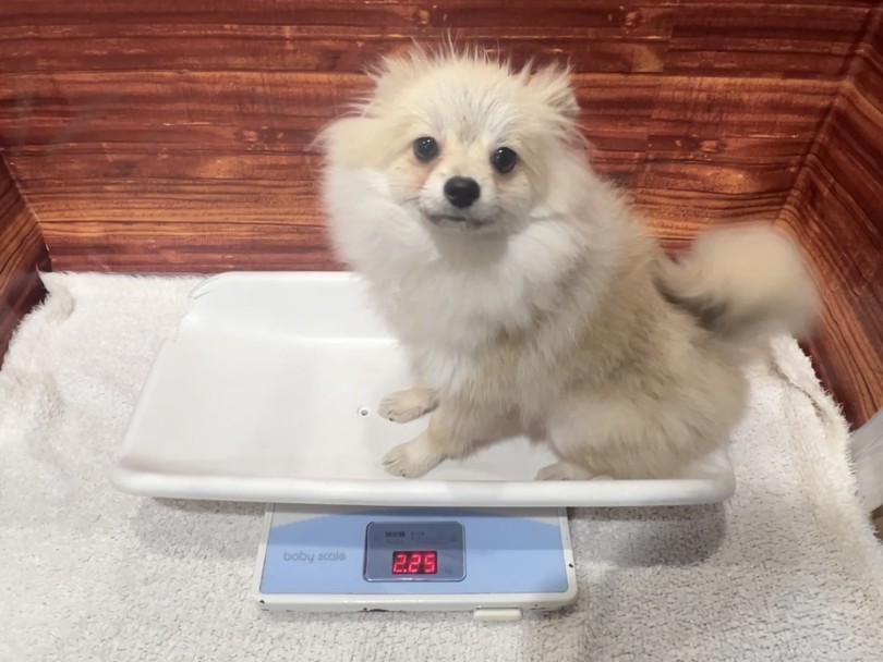 生後6ヶ月を迎えた現在、体重計の上でちょこんとおすわりしてくれました。
