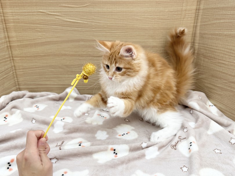 最近は運動量もグッと増え、遊びモードになるととても俊敏な動きを見せてくれます♪入店時より猫じゃらしへの反応は抜群だったメインクーンちゃんでしたが、動きにメリハリが出てきたので油断するとすぐ捕まえられてしまいます(笑)