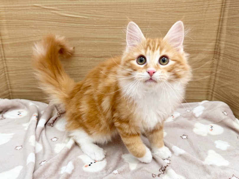 生後5ヶ月を迎えたメインクーンちゃん♡お店に来た時は新しい環境にドキドキの様子で、小さな身体を丸めて様子を伺ったりしていましたが、今ではすっかりお店にも慣れてお部屋の中で飛んだり跳ねたりする姿を見せてくれます!