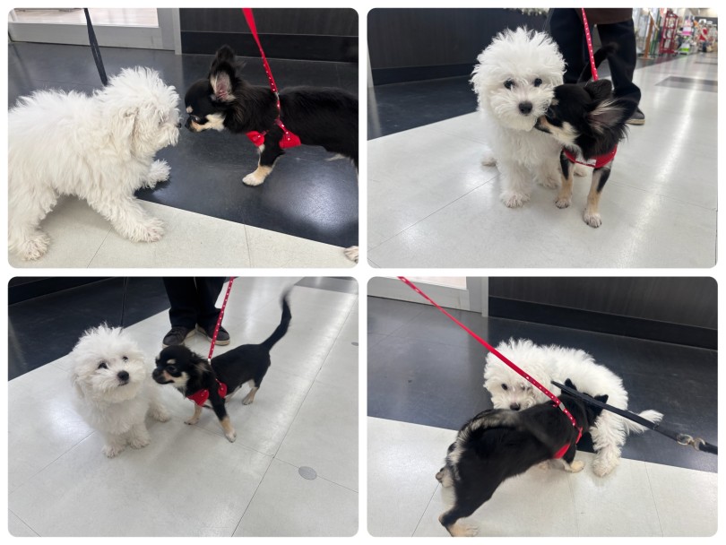店内のお散歩練習中も、卒業生のわんちゃんに遭遇して自らご挨拶にいくとてもフレンドリーな性格の持ち主です!!