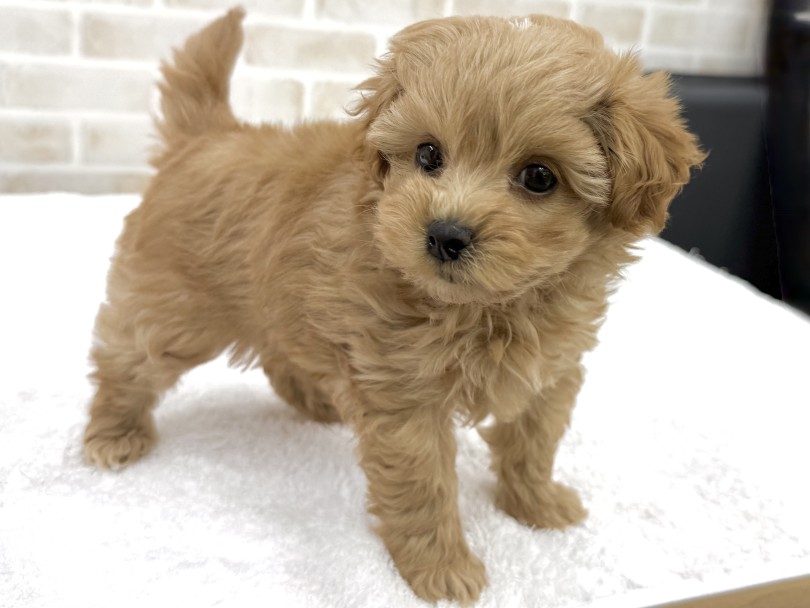 マルプーは、トイプードルの巻き毛とマルチーズの直毛が混ざり、「直毛」、「ウェーブ」、「巻き毛」の3タイプの被毛に分かれます。鶴見店のマルプーちゃんは、両親の特徴がちょうど混ざりウェーブのかかった柔らかな被毛で生まれて来てくれました^^