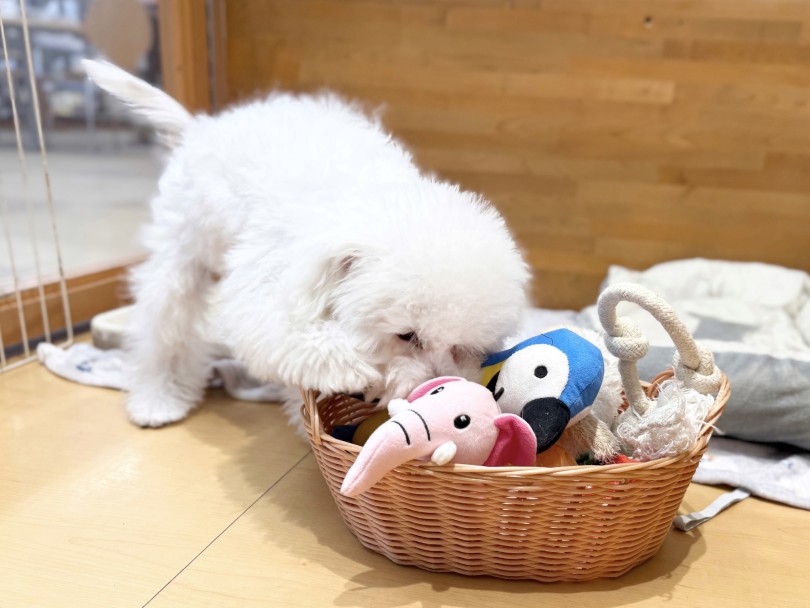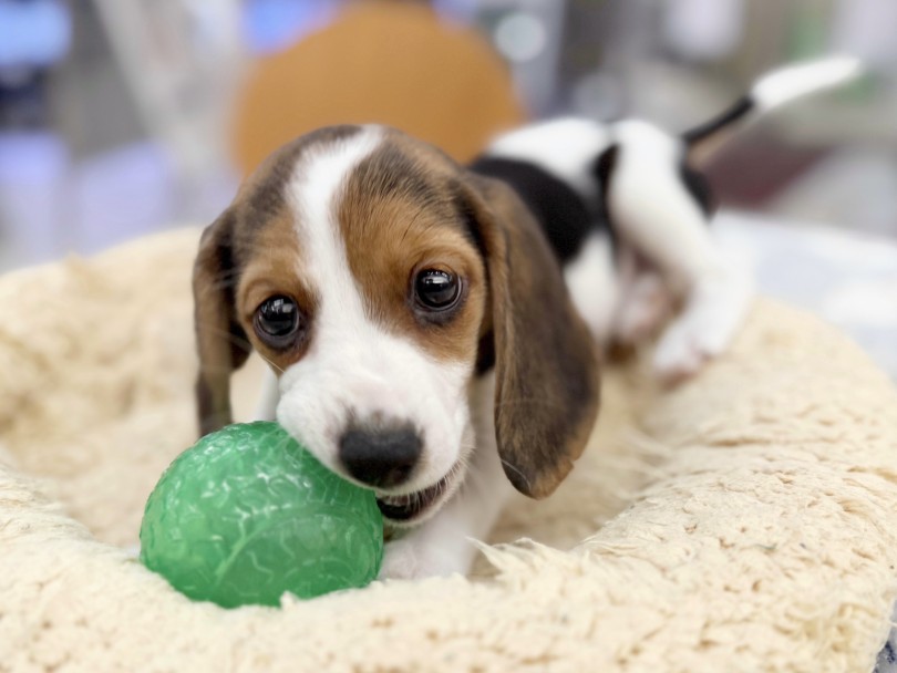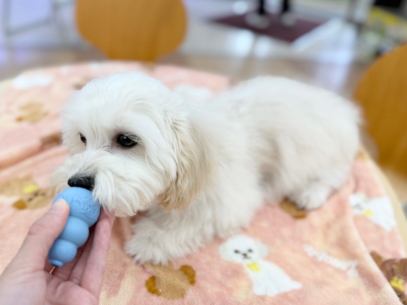 ①嚙んでいいものをローテーションであげる(硬さや素材が違うものを3種類ほど)→子犬によって好みが違うので、選べるようにしてあげるのが大事。