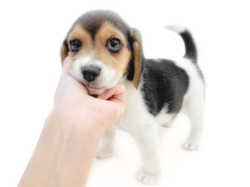 大きな垂れ耳に、アイラインのしっかり入ったつぶらな瞳。ホワイトブラック&タンの模様が特徴的なビーグルの男の子が下丸子店に仲間入りしました。