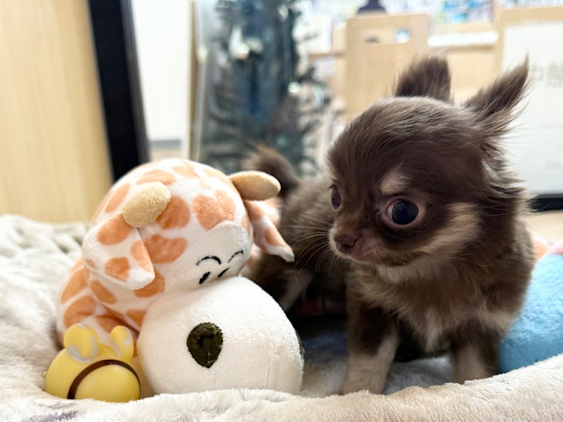 元気いっぱい人懐こい性格のチワワちゃん。入店初日、犬舎に入ってすぐに用意していたオモチャで全く緊張もせず1人遊びを始めました。