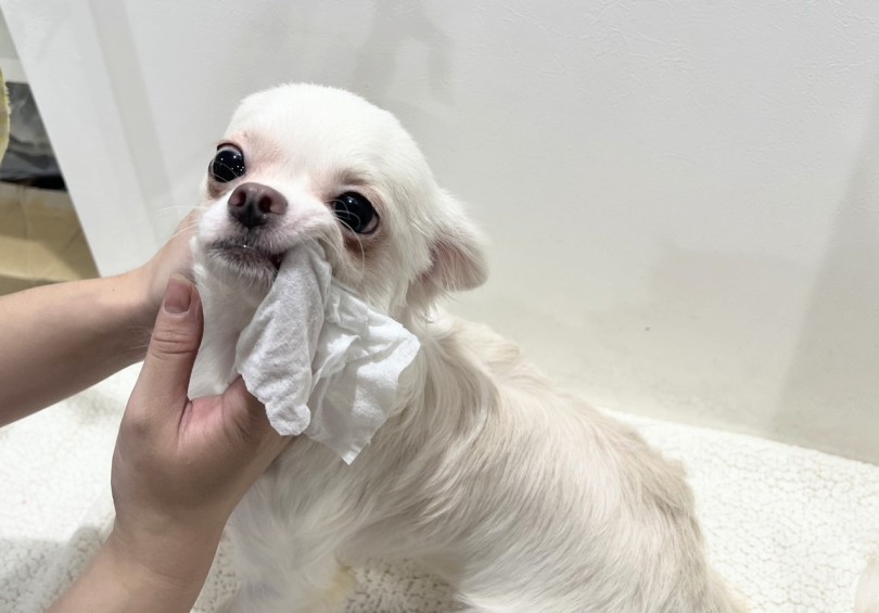 ワンちゃんの様子を見て声をかけながら1本1本丁寧に磨いていきます。