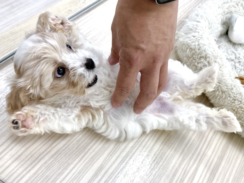 若齢ステージの生後2〜4ヶ月はワクチン接種期間ということもあり、「お手入れ」「保定」を中心としたトレーニングを。