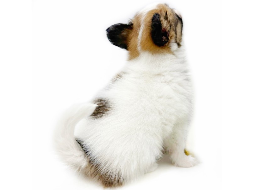 パピヨンはサラサラで艶のある長毛が魅力的で、成長とともに大きな耳に飾り毛が現れ、体や足や尻尾もゴージャスな毛に覆われて優美な雰囲気に変身します。
