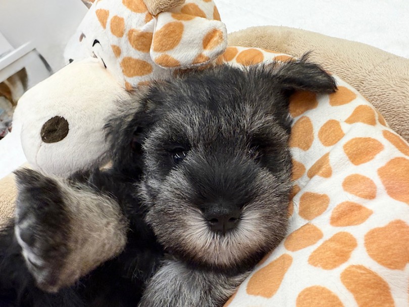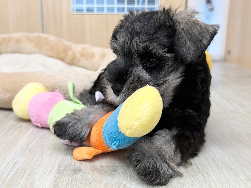 子犬の頃はブラック多めですが、成長過程でシルバーがかった毛色へ変化していきます。