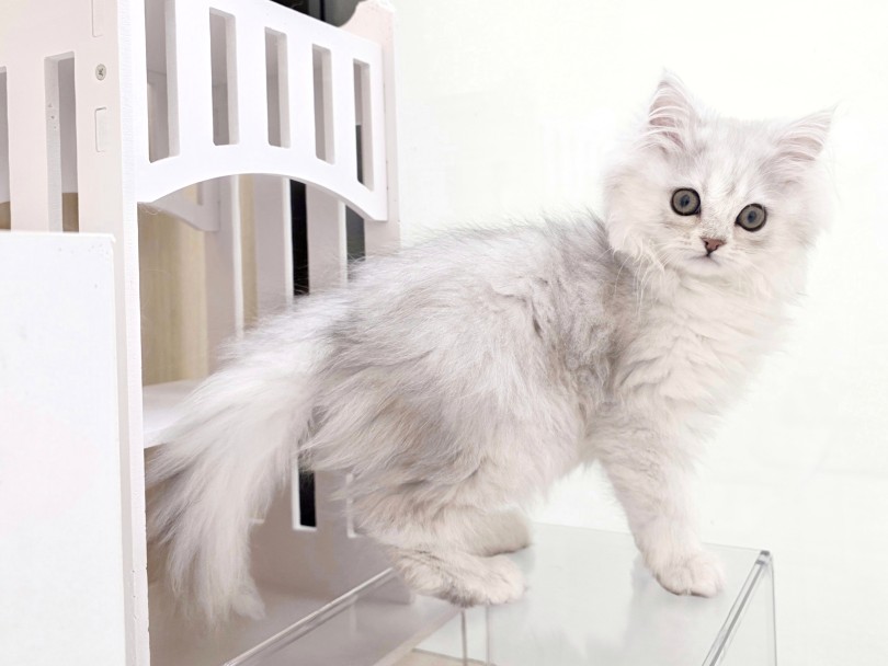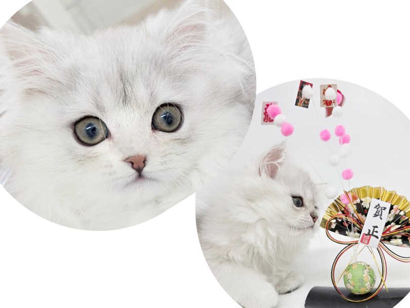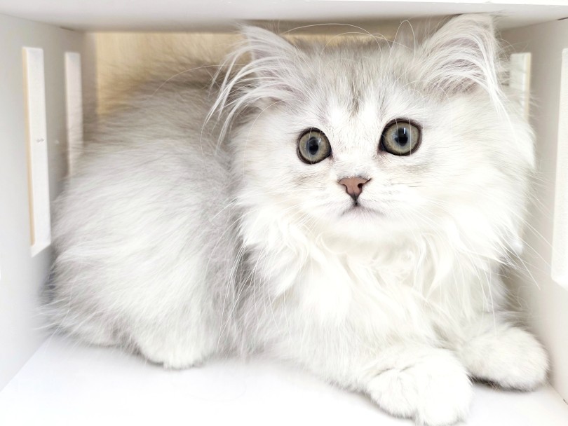 毛色はペルシャの毛色の中でも特に人気があるチンチラシルバー。内側から光を含んだような美しいグラデーションが特徴です。