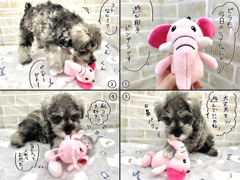 この子の性格は、シュナウザーらしい知性と、パピーならではの無邪気さが美しく調和した魅力にあふれています。今回はシュナちゃんの遊び相手としてピンクのゾウさん、「ピンぞう」くんと遊んでもらいました!