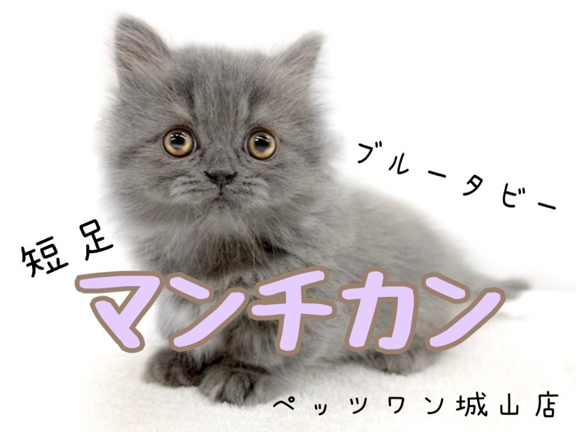 マンチカンは毛色の種類が豊富で、様々なカラーリングの子がいます。城山店のマンチちゃんは、その中でも希少なブルータビーというカラーのマンチちゃん。