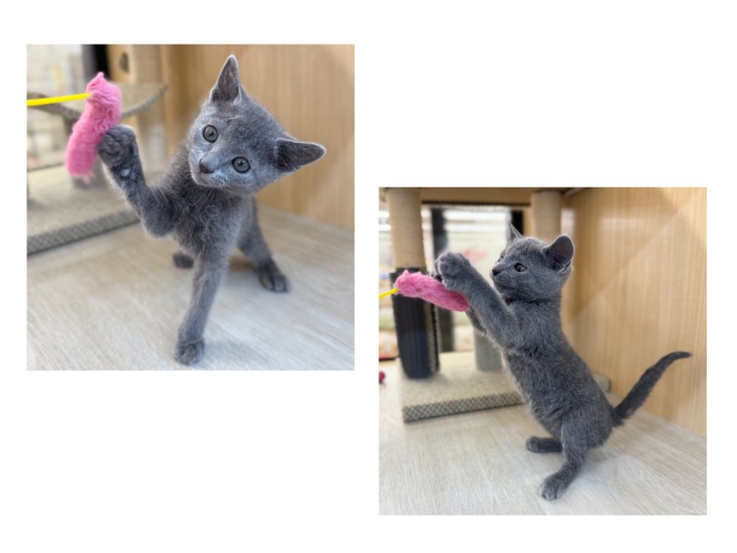入店初日から緊張せずにオモチャで1人遊びを始めたロシブルくん。扉を開けると喉をゴロゴロ鳴らしながら体と頭を擦り付けて甘えてきました。
