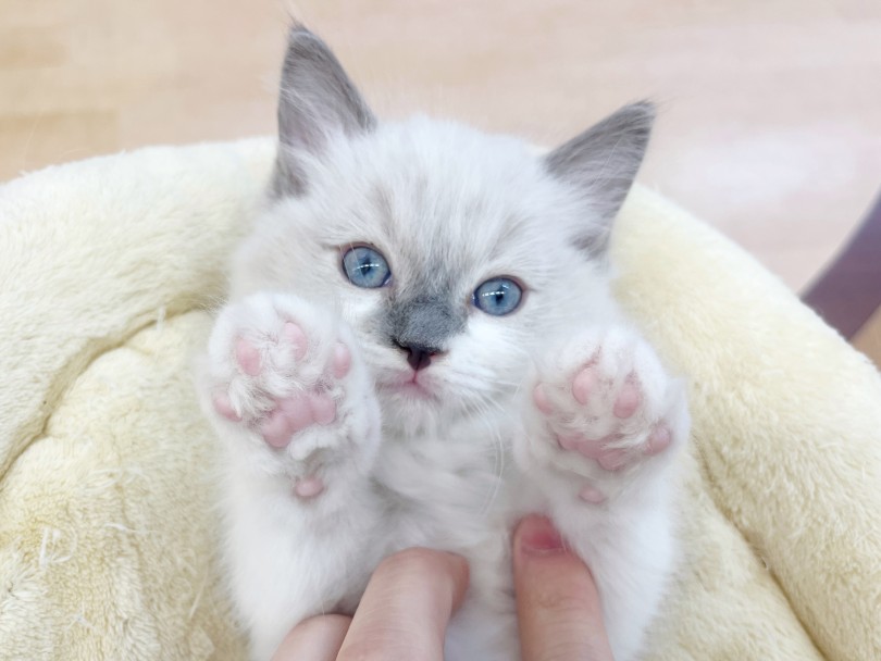 お耳や尻尾に入る優しいグレー(ブルー)のポイントカラーと、透き通るような青い瞳のコントラストは、まさに「生きた宝石」です♪