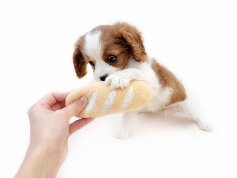 パンのおもちゃに手をかけてじっと見つめる姿からも伝わる、初日とは思えないほどの適応力。初めましての瞬間からフレンドリーで、キャバリアらしいコミュニケーション能力の高さと懐っこさを早くも発揮。