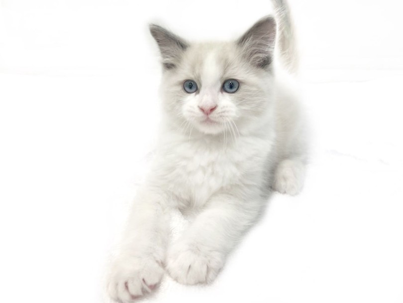 ふわふわの被毛に澄んだブルーの瞳、そしてクリスマスが誕生日のブルーポイントバイカラーのラグドールの男の子。